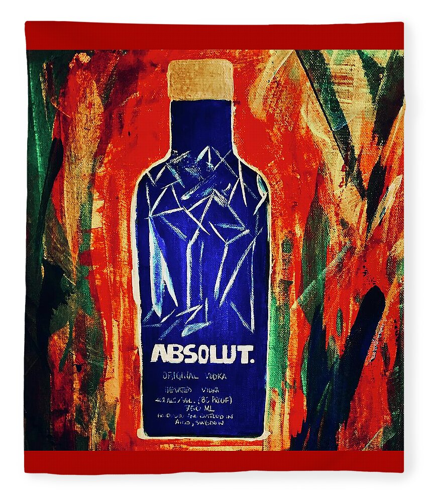 A blue (Absolut Vodka) bottle with geometric patterns stands out against a vibrant and abstract background of orange and green hues. The word "Absolut" is prominently displayed in white text on the bottle.