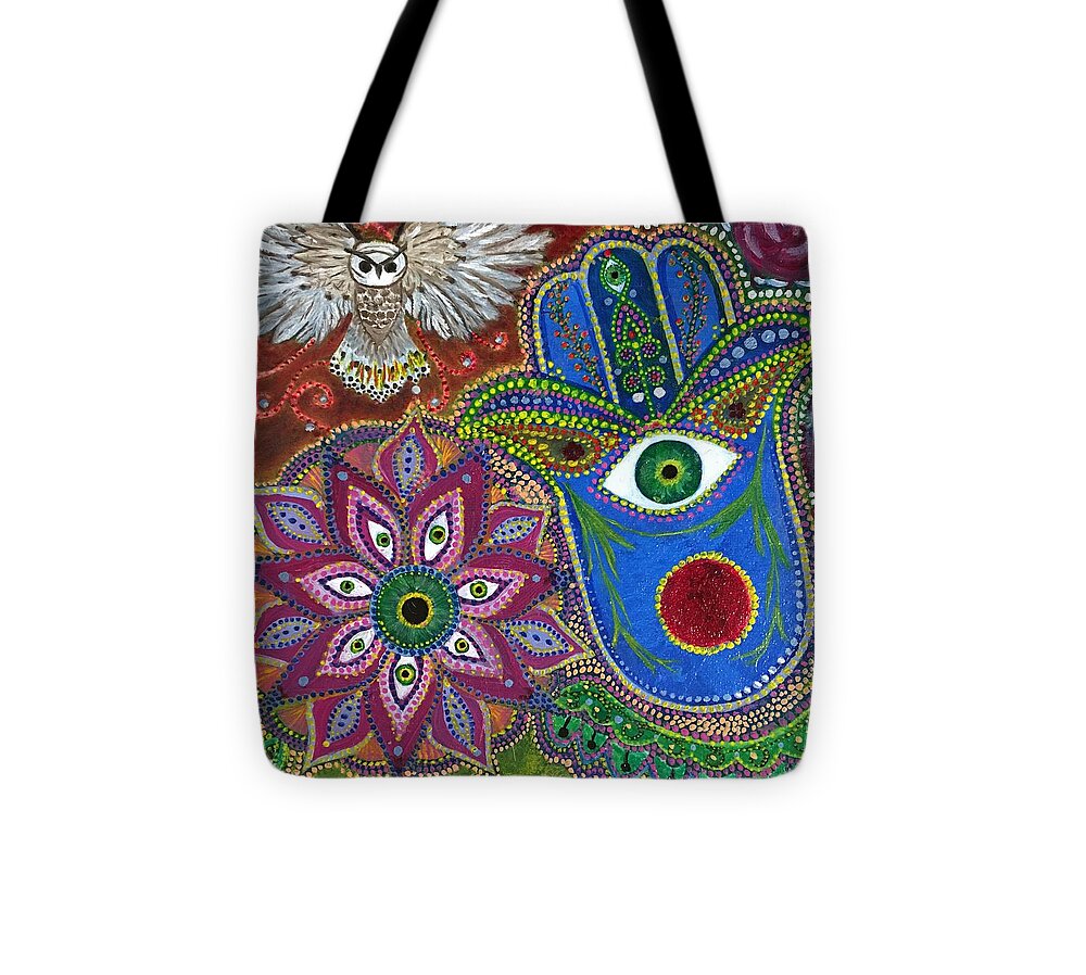 "Protection" by Sharmaine Rayner Tote Bag of an exquisite oil painting blending visionary art and traditional symbolism. Rendered in exquisite detail, the piece depicts a majestic owl with a hamsa and eyes in the petals of a flower, creating a powerful image of protection. Bring this timeless work of art into your home or office and feel the power of its symbolism. The Hamsa symbolizes "The Hand of God" and Protection, The owl being the predator, the flower with eyes symbolizing the constant surveillance we experience everyday. So these three together is the protection from surveillance and predators. The original painting has been sold.